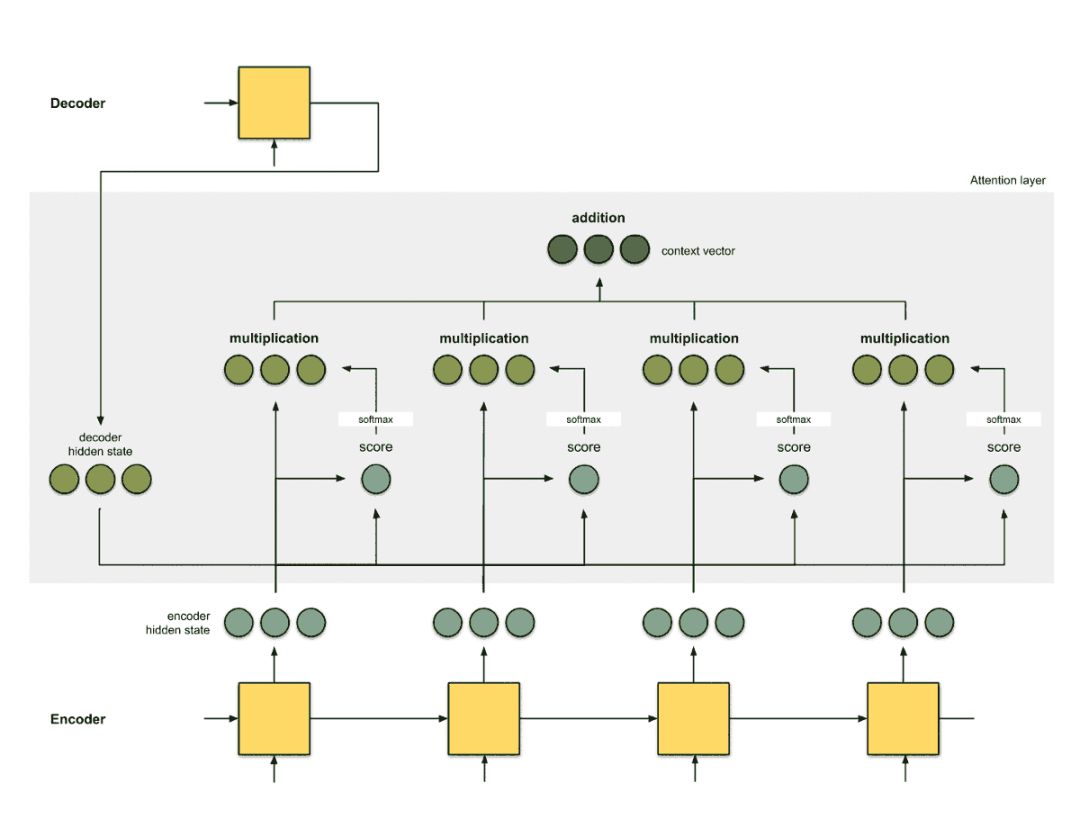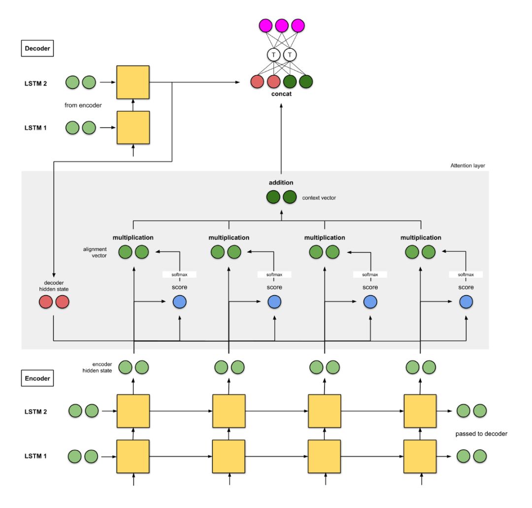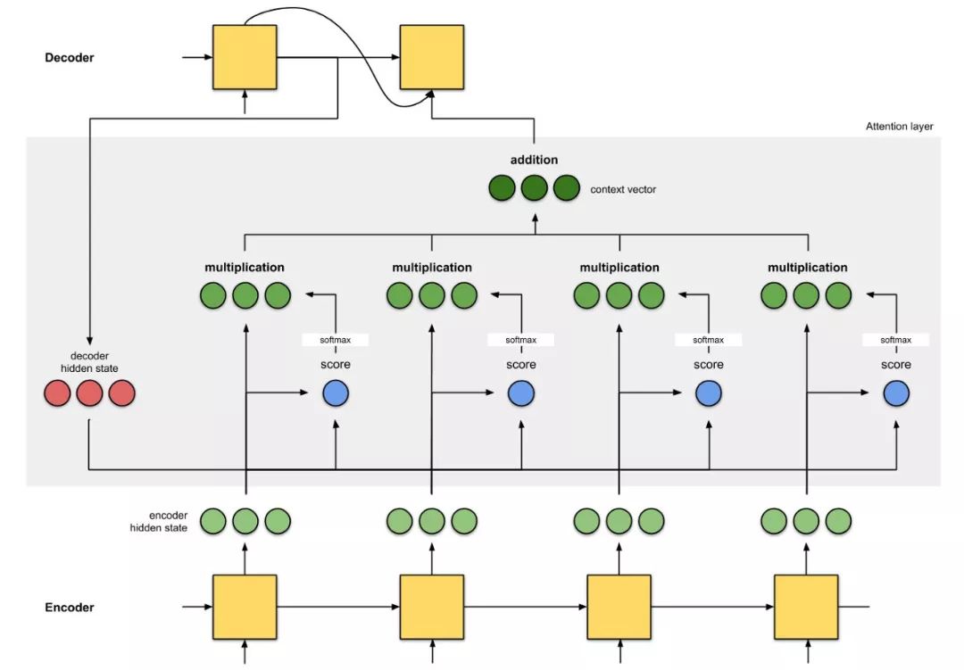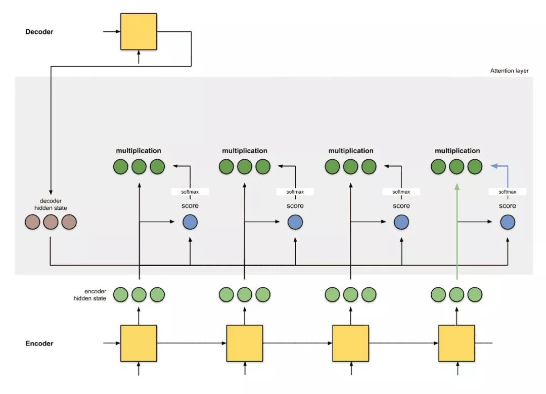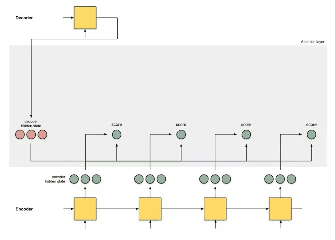 首先准备第一个解码器隐藏状态(红色)和所有可用的编码器隐藏状态(绿色)。示例中有 4 个编码器隐藏状态和当前解码器隐藏状态。