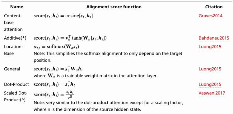 以下是 Lilian Weng 编写的一些评分函数。本文提到了 addictive/ concat 和 dot product。涉及点积运算(点积、余弦相似度等)的评分函数的思路是度量两个向量间的相似度。对于前馈神经网络评分函数,思路是让模型学习 alignment 权重和译文。