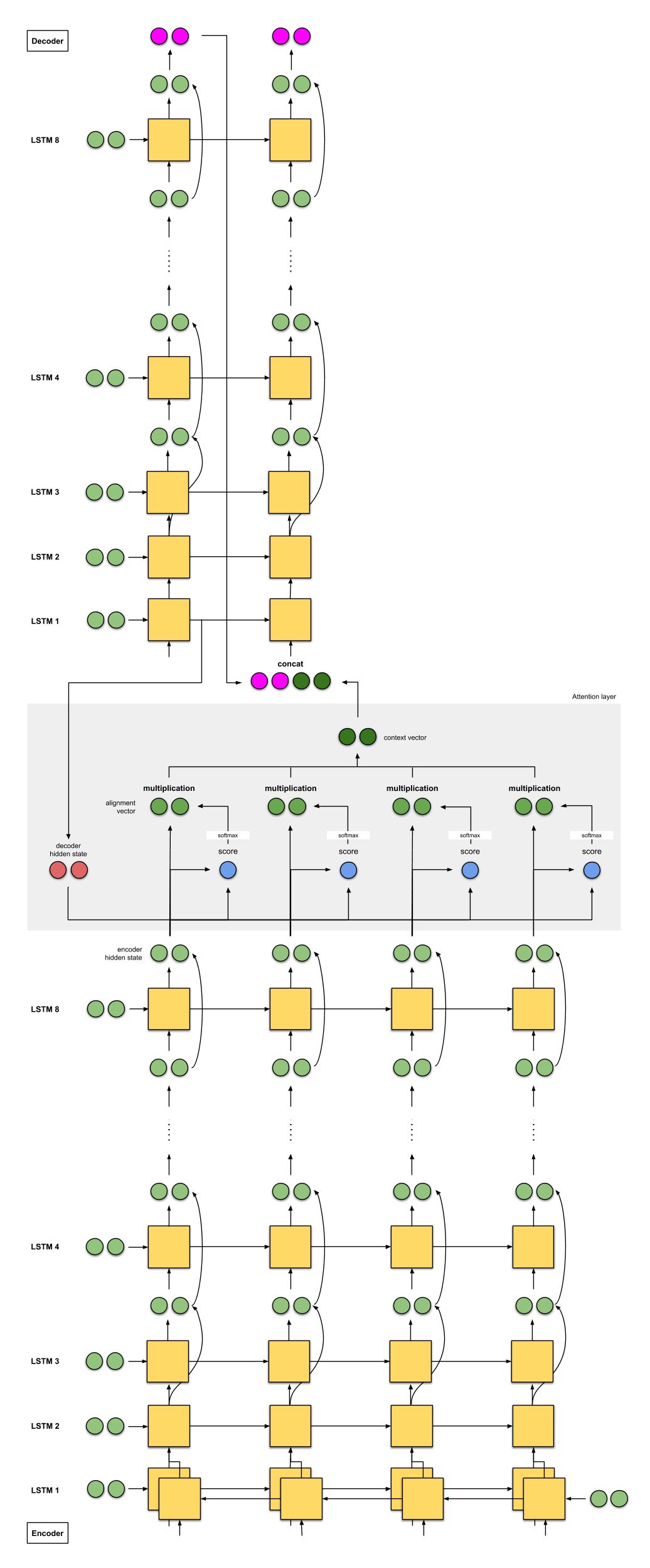 编码器由 8 个 LSTM 组成,其中第一个是双向的(其输出是级联的),连续层(从第 3 层开始)的输出之间存在残差连接。解码器是 8 个单向 LSTM 的独立堆栈。