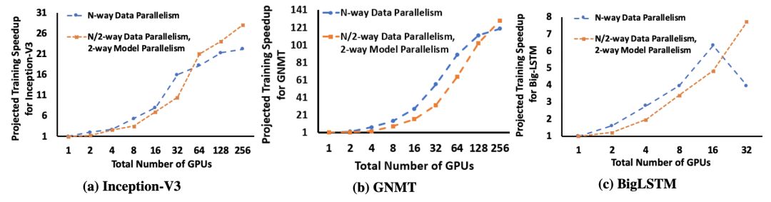 下图 5 展示了 Inception-V3、GNMT 和 BigLSTM 模型在使用混合并行化策略和 DP 策略时的加速对比结果。 从图中我们可以看出,当统计效率损失降低了 DP 策略的有效性时,混合并行化策略可以保持更高的性能。
