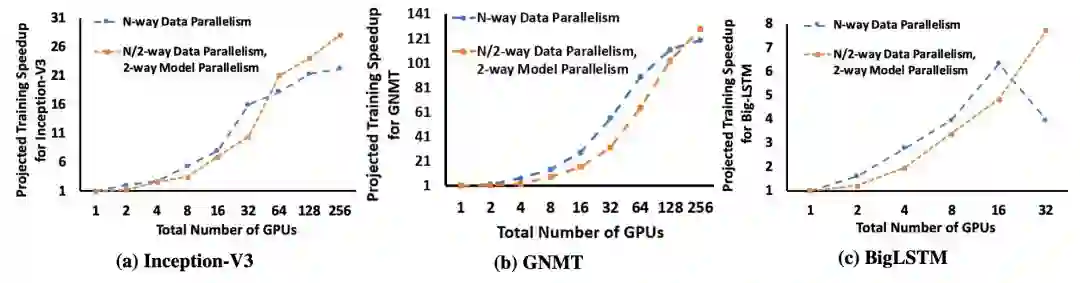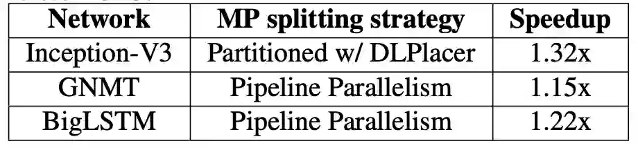 研究者实现了 InceptionV3、GNMT 和 BigLSTM 的双路模型并行化版本,发现相比仅使用 DP 策略,混合训练可提供至少 26.5%、8% 和 22% 的加速。