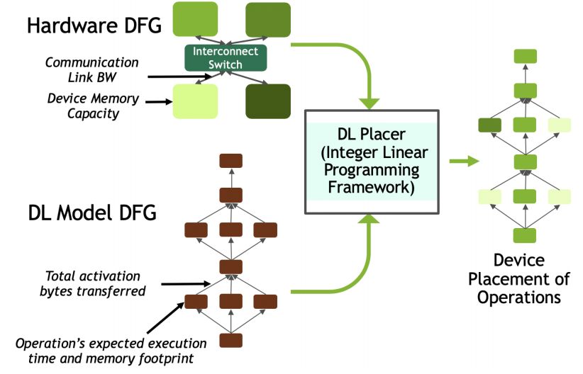 为此,该研究开发了一种基于整数线性规划 (ILP) 的设备布局工具——DLPlacer。 该工具可以通过提取模型中不同操作之间的并行化来实现资源最大化利用,同时最小化计算节点间移动数据的通信开销。
