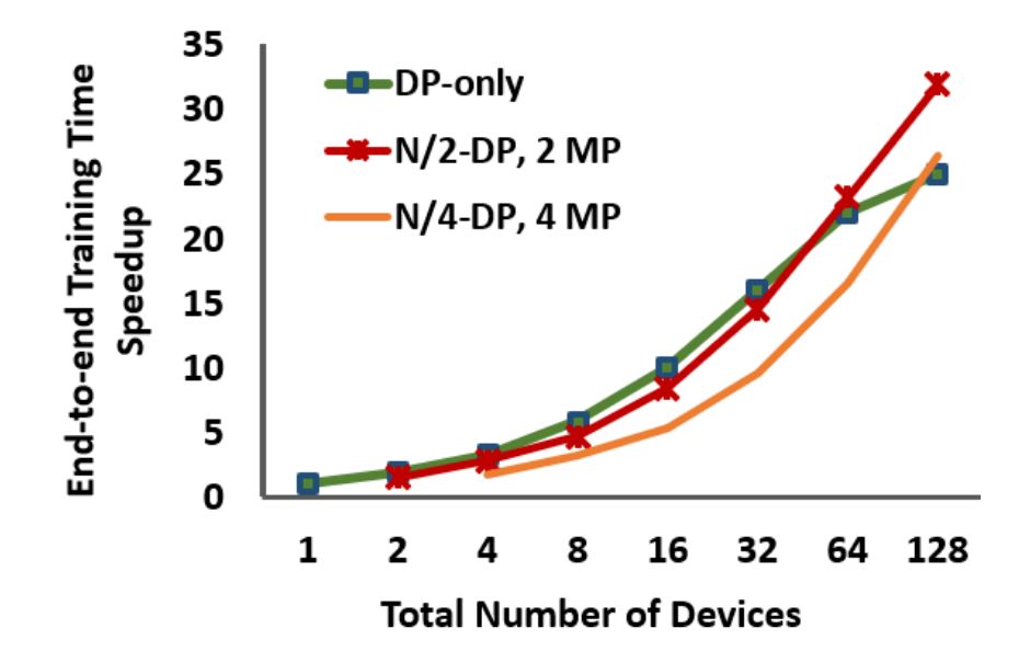 该研究的新颖之处在于,当设备数量(及全局批大小)增长到某个点时(此时 DP 的扩展性能急剧下降),可以将 MP 和 DP 结合起来使用,从而继续改善训练时间。 通过 MP 实现的加速在该临界点是非常重要的。 该研究表明,每个网络都有一个独特的规模(scale),使得 MP 获取的加速能够解决 DP 的扩展性能和统计效率下降问题。