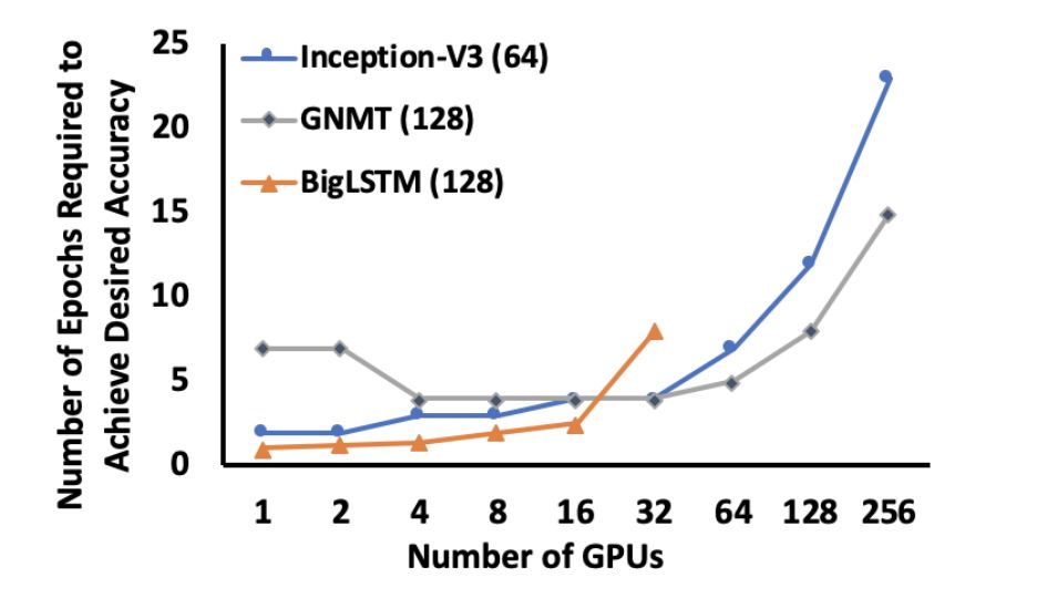 研究者对 Inception-V3、GNMT 和 BigLSTM 模型进行了评估。 下图 4 展示了获得预期准确率所需的 epoch 数量与数据并行训练中使用 GPU 数量的关系,epoch 数量通常会随着 GPU 数量的增加(即全局批大小增大)而增长。