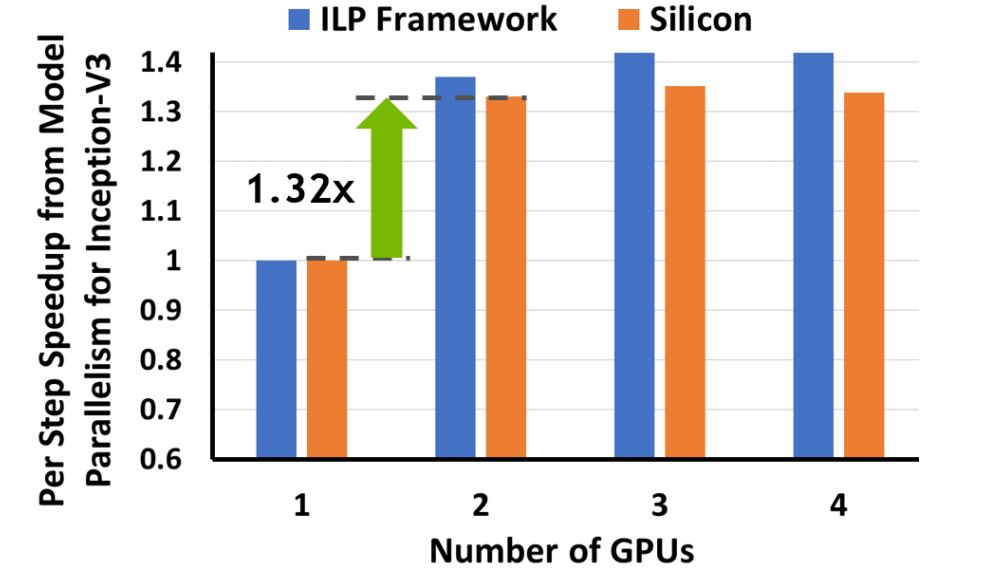 值得注意的是,在 2 个 GPU 的设置下,真实实验获得的加速(1.32 倍)与在三或四个 GPU 上获得的加速几乎一样。 其原因在于该网络可进行的并行化有限,DLPlacer 在 2 个 GPU 的情况下几乎完全穷尽了并行化。
