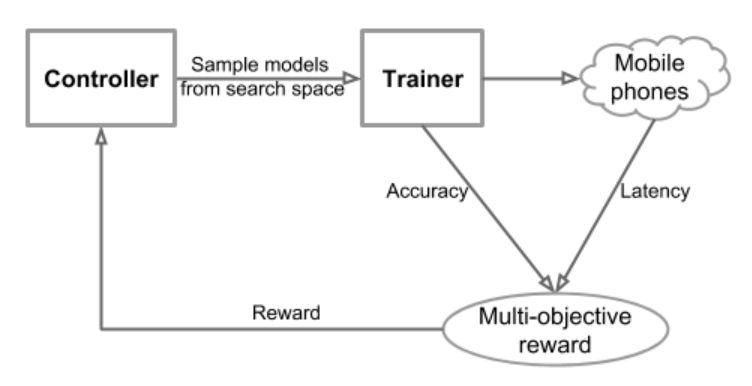 我们方法的总体流程主要包括三个部分:一个基于 RNN 的学习和采样模型架构控制器,一个建立和训练模型以获得准确率的训练器,以及一个使用 TensorFlow Lite 测量真实手机上模型速度的推理引擎。我们制定了一个多目标优化问题,旨在实现高准确率和高速,并利用带有定制奖励函数的强化学习算法来寻找帕累托最优解 (例如,具有最高准确率但速度不变的模型)。
