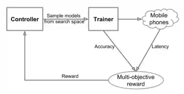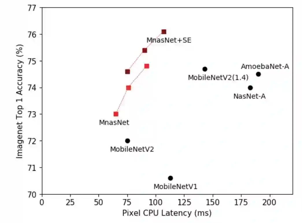 在《MnasNet: Platform-Aware Neural Architecture Search for Mobile》一文中,我们探索了一种使用强化学习设计移动端模型的自动化神经架构搜索方法。为了处理移动端速度限制,我们明确地将速度信息纳入搜索算法的主要奖励函数中,以便搜索可以识别一个在准确率和速度之间实现良好平衡的模型。如此,MnasNet 能够找到运行速度比 MobileNet V2(手工制造的最先进水平)快 1.5 倍、比 NASNet 快 2.4 倍的型号,同时达到同样的 ImageNet top-1 准确率。