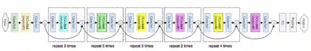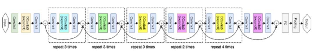 我们的 MnasNet 网络从新型因子化层级搜索空间中采样,上图展示了网络架构中的不同层级。