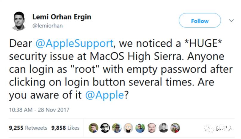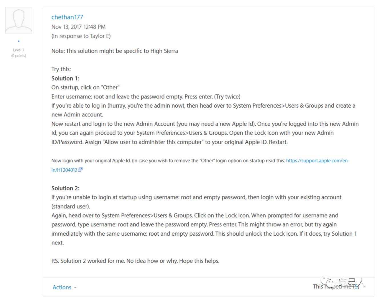 根据 Twitter 上的用户以及一些信息安全博客的说法,目前这个漏洞仅限于 macOS High Sierra。硅星人又在另一台安装了 macOS Sierra 的 12' MacBook 上测试,没能复现。