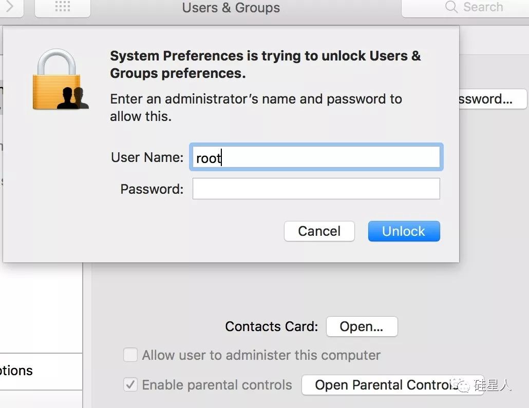 硅星人可以确定,这一漏洞其实不是有意而为之,应该实属负责这部分的程序员(也可能是实习生)脑子进水——因为,mac OS 里其实隐藏了一个最高权限的账户,用户名就是 root,是留给苹果维修人员和 IT 人士的,一般用户不会看到。而今天这个漏洞的情况,应该是苹果自动打开了该账户,留了空的密码,还没告诉用户。(文末有补上漏洞的教程)