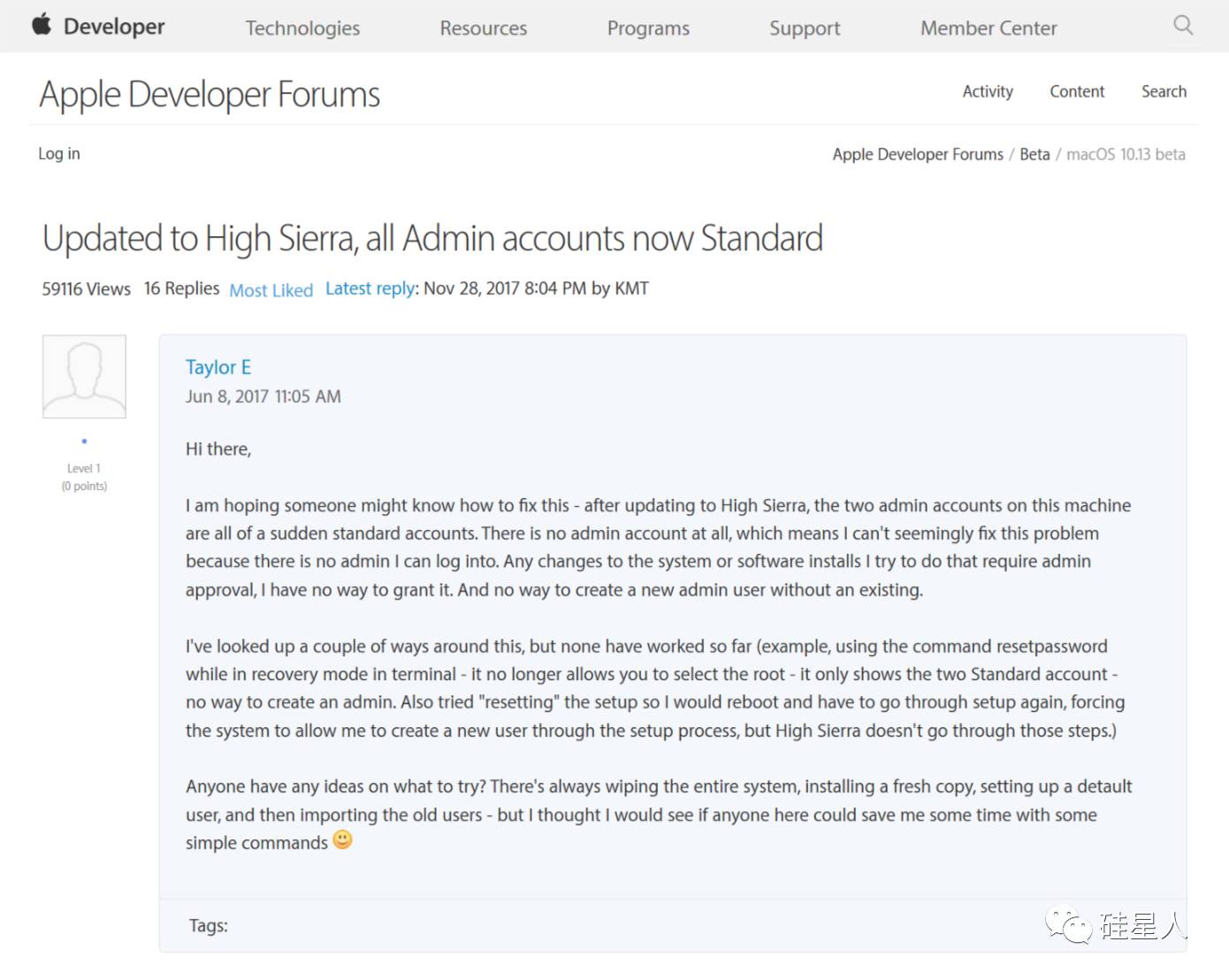 2017 年 6 月 5 日,macOS High Sierra 正式推出并免费向绝大多数 Mac 用户推送。而根据硅星人的查证,最早在今年 6 月 7 日——新系统推出两天后——就有用户在苹果开发者论坛留言: