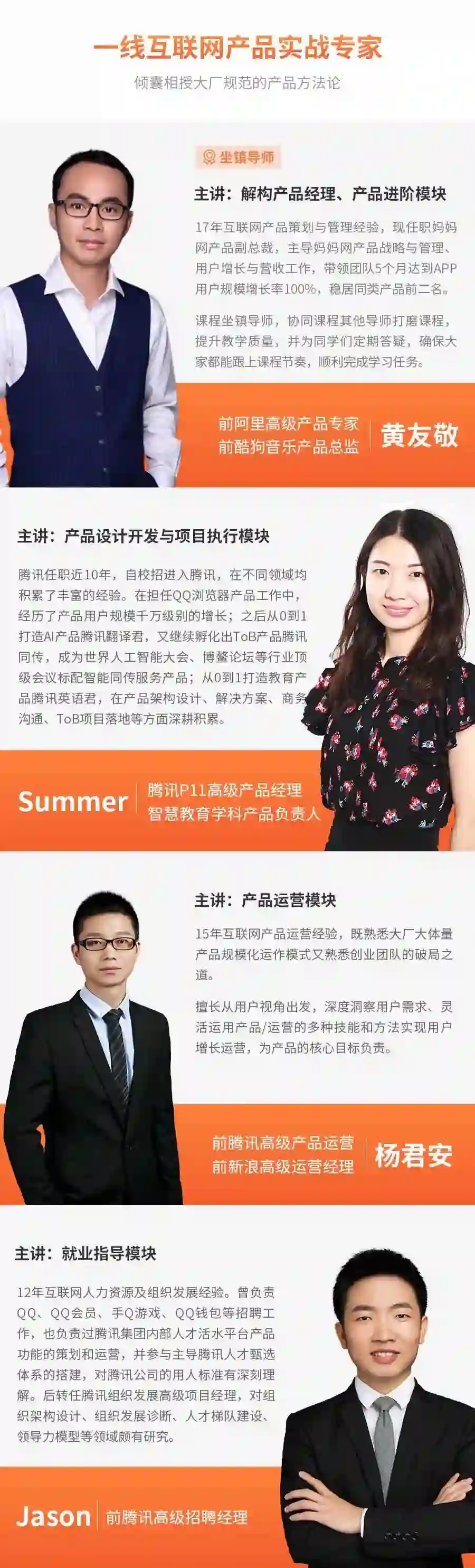 一个行业内靠谱的导师,可以让自己比同龄人少走很多年弯路,90天产品班的导师都来自腾讯、阿里、百度、华为等大厂,平均工作年限在8年+以上,都是久经沙场的老兵,他们不仅拥有多年产品实战经验,而且经历过大厂上亿项目,在课程中能够毫无保留地把他们多年沉淀下来且依然实用的产品方法论传授给大家。