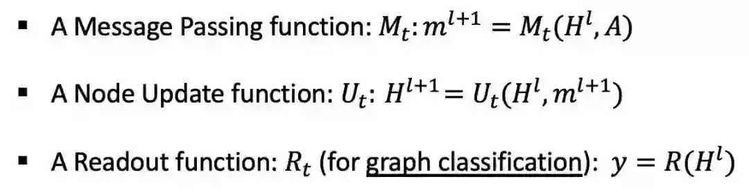 任何图神经网络可被表达为与消息传递神经网络(J. Gilmer et al. , 2017)的消息传递功能,节点更新功能和读出功能。