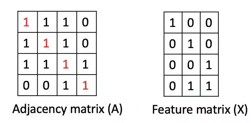 注意,邻接矩阵的对角线故意更改为“ 1”,以为每个节点添加一个自环。当我们执行特征聚合时,这将包括每个节点本身的特征。