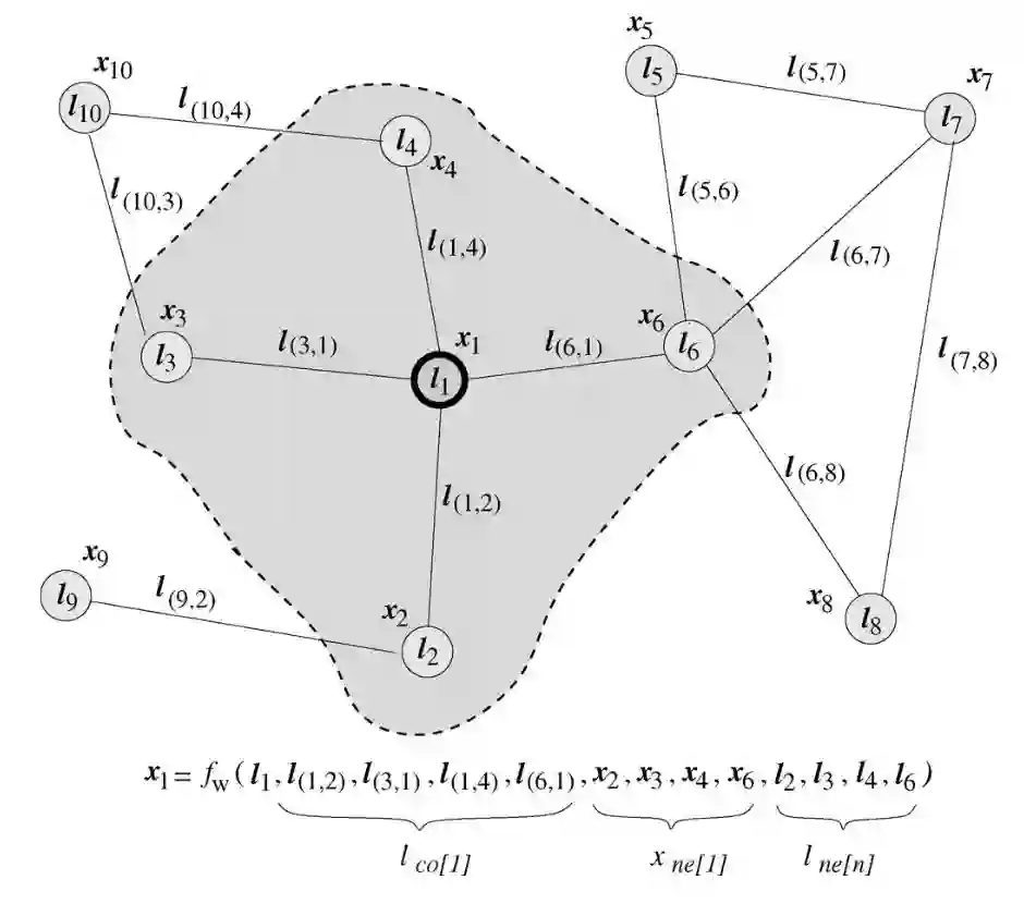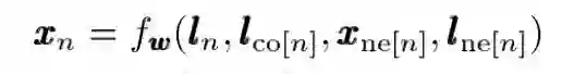 其中L_N,l_co,x_ne,l_ne 表示当前节点的特征[n],节点的边缘[n],相邻节点的状态,与相邻节点的功能。(在原始论文中,作者将节点特征称为节点标签。这可能会造成一些混乱。)