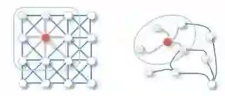 Left: Convolution on a regular graph such as an image. Right: Convolution on the arbitrary graph structure. Figure from “A Comprehensive Survey on Graph Neural Networks”