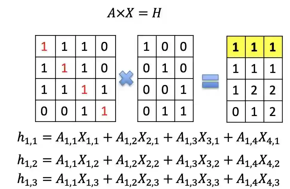 然后,我们执行A x X(为简单起见,我们先忽略A的拉普拉斯算子和权重矩阵W。)
