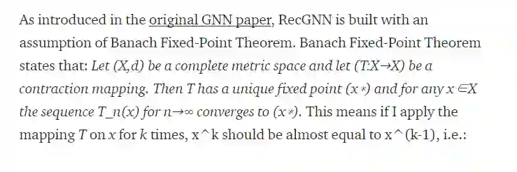 介绍的那样,RecGNN是基于Banach不动点定理的假设而构建的。Banach不动点定理指出:(X,d)是一个完整的度量空间,而(T:X→X)是一个压缩映射。然后,T具有唯一的不动点(x ∗),对于任何x∈X,n→∞的序列T_n(x)收敛到(x ∗)。这意味着,如果我申请的映射T上X为ķ倍,X ^ K在几乎等于x ^(K-1),即: