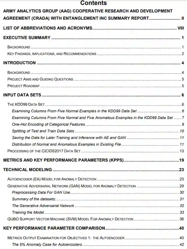 CRADA下的工作最终验证了解决网络安全异常检测的能力,比传统方法更快,并具有更好的性能,正如关键性能参数(KPP)所衡量。关键性能参数涵盖了与每秒总推断量、检测到的威胁百分比、准确性、召回率、精确度、其他基于混淆矩阵的指标以及曲线下面积(AUC)有关的指标。对于额外的变量或更大的数据集,Entanglement/Groq能力提供了比传统方法更高的效率,可以大规模地解决原本难以解决的问题。核心技术是一种专有的专用数字电路设计,具有高度的并行性,用于解决可表示为深度神经网络模型和二次无约束二元优化(QUBO)问题的各类问题。AAG以前的努力显示了每秒检测12万个推断的能力。这是用QUBO模型作为基准和标准所能达到的指标。基准是基于一个解决方案集,它将算法解决方案与专有的量子启发芯片结合起来。芯片解决方案可以扩展到卡、节点,甚至更多。此外,为CRADA的可行性而设定基准的现有解决方案已经在开发下一代的更新,这将提高模块化程度并减少热信号。在六个月内,Entanglement能够实现每秒72,000,000次推断的异常检测率,并展示了在广泛的数据处理系统领域实现每秒120,000,000次推断的潜力。验证案例由KDD Cup 1999(KDD99)数据集和CICIDS2017数据集构建。如模型性能部分所述,AE和GAN解决方案的计算输出在确定异常情况方面非常有效。QUBO SVM是以量子化形式建立的,在异常检测方面也很有效,最后能够在大约250毫秒内完成整个数据集的计算。