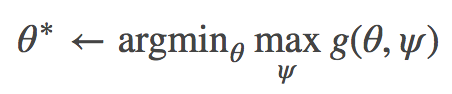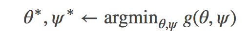 然后就可以解决在双人博弈中找到稳定均衡的问题,博弈中双方分别最小化与 ψ 有关的损失函数 g 和与 θ 有关的损失函数 h。