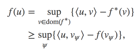 凸共役性(Convex conjugate):损失函数包含密度的凸函数(如 f 散度),你可以通过用凸共役性的形式重新表述来变换你的问题。f 关于其凸共役性 f∗ 的表达式为:
