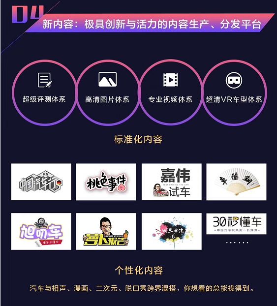 因此易车在2017年不断加大连接上的投入。比如,在媒体业务上一方面建立标准化内容体系,完善或新建高清图片库、专业视频库、超清VR车型库、超级评测体系等,对大家司空见惯的汽车互联网内容从底层进行全面升级,满足内容生产者对素材的需求,以及普通用户对专业、权威内容的需求;另一方面易车也在积极地孵化个性化的内容,签约40多个泛汽车领域知名IP,并与微博大V、知名微信公众号、网红达人等KOL合作,在互动内容和社会化营销上寻求突破。