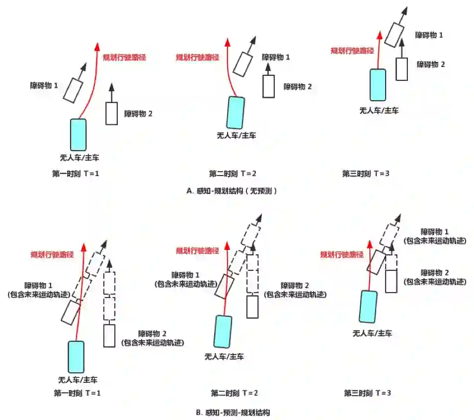 图1中蓝色方块代表无人车,白色代表行人。上半部分描述的是在不带行人轨迹预测功能情况下无人车的行为。这种情况下,无人车会把行人当做静态物体,但由于每个时刻行人都会运动,导致无人车规划出来的行驶轨迹会随着时间不停地变化,加大了控制的难度,同时还可能产生碰撞的风险,这样违背了安全平稳行驶的目标。下半部分是有了行人轨迹预测功能情况下的无人车行为。这种情况下,无人车会预测周围行人的行驶轨迹,因此在规划自身行驶时会考虑到未来时刻是否会与行人碰撞,最终规划出来的轨迹更具有“预见性”,所以避免了不必要的轨迹变化和碰撞风险。