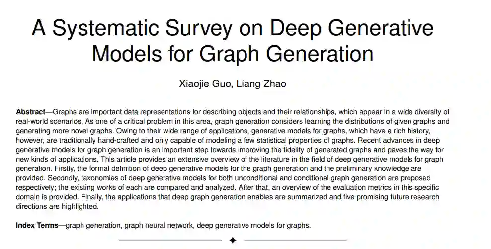 最近在用于图生成的深度生成模型方面的进展是提高生成图的保真度的重要一步,并为新类型的应用铺平了道路。本文对用于图生成的深度生成模型领域的文献进行了广泛的概述。首先,给出了面向图生成的深度生成模型的形式化定义和初步知识;其次,分别提出了用于无条件和条件图生成的深度生成模型的分类;对各自已有的工作进行了比较分析。在此之后,将概述此特定领域中的评估指标。最后,总结了深度图生成的应用,并指出了五个有发展前景的研究方向。