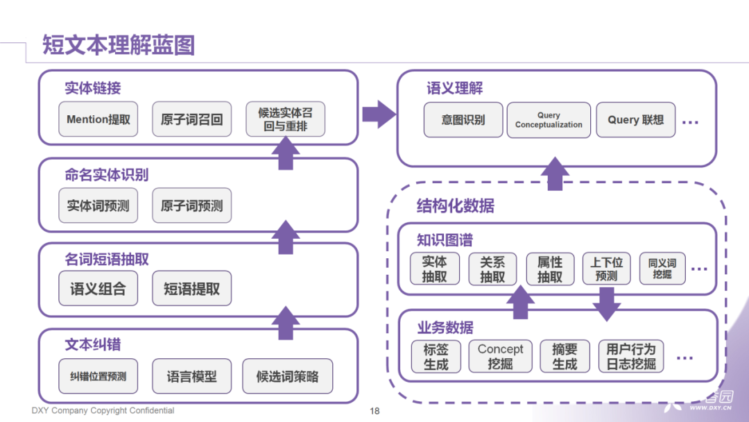 为了改善上面提到的几种情况,我们尝试把短文本理解的流程拆成了五个步骤。前四个步骤主要解决实体识别的准确率问题,包括文本纠错、名词短语抽取、NER ( 命名实体识别 ) 和实体链接。第五步需要结合底层数据的积累,包括知识图谱的建设以及结合具体业务场景的数据来完成query语义上的扩充。