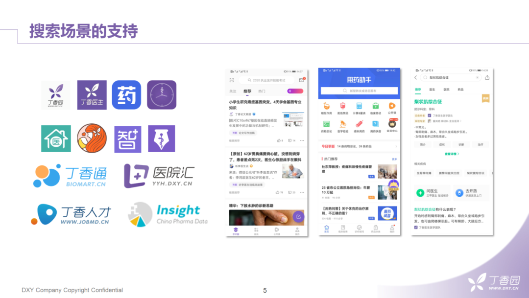 搜索作为丁香园的基础服务,需要支持多个社交与工具类的应用,主要包括:丁香园论坛、用药助手、丁香医生、丁香家商场等主要App。处理的文本数据需跨越大众和专业医学这两个领域,涉及的业务线也需处理不同的场景。