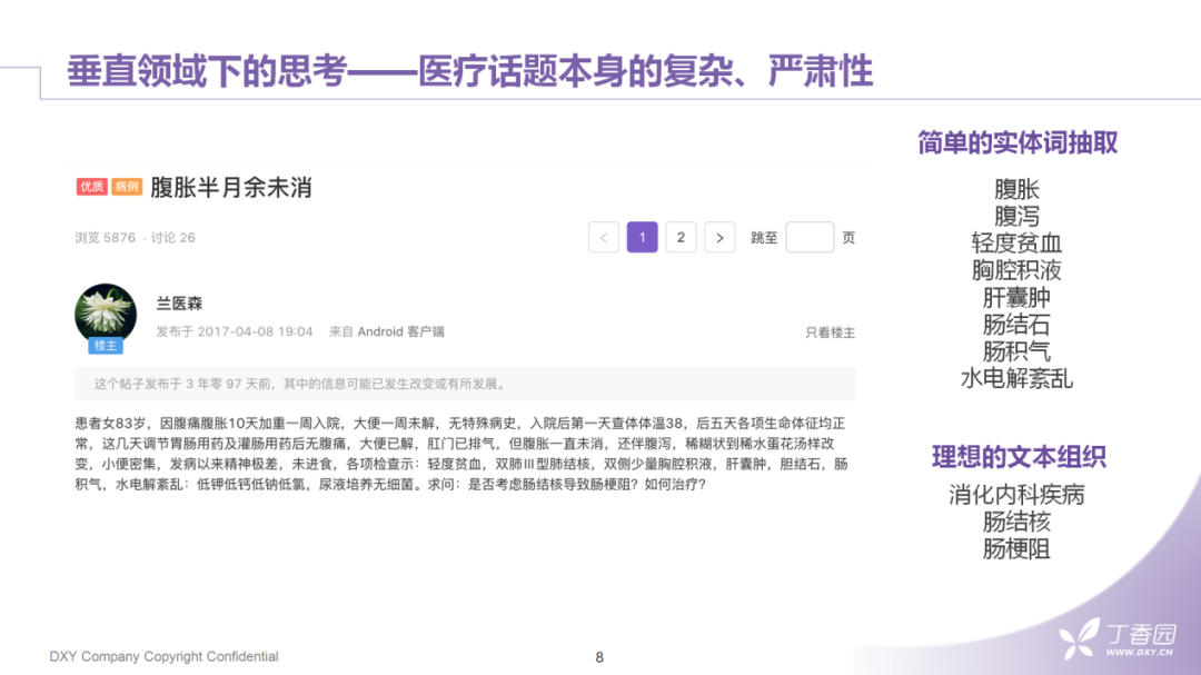 对于医学知识本身的复杂性,在处理面向医生的文本数据时,是不得不面对的问题。例如,这是在丁香园中的一则病例讨论。这位医生详细描述了在工作中遇到的一则病例,其中包括了非常多的专业术语。我们用了一个简单的实体抽取方法进行抽取可以获得"腹胀"、"腹泻"这样的疾病症状词。但是全文的信息量不仅在于这些实体词上,也有相当一部分是存在于这些词之间,复杂的逻辑关系。在常见的搜索方法中,我们会用词的倒排索引来完成文章检索这件事,但是倒排索引在执行过程中很难保证主题不会发生偏移。在理想情况下,我们更希望抽象出更具概括性的标签来结构化这些数据。