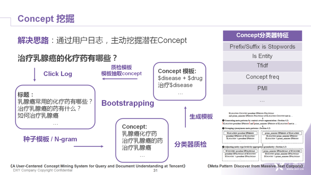 首先,我们收集了一批用户的搜索点击日志,然后在启动阶段定义一些种子模板,再利用模板和N-gram的策略产生一批短语,这些短语不会直接拿来用,因为其中会有一些边界问题或者模板带来的语义漂移问题。所以对生成的这些原始concept,我们会做一个分类器,作为在质量上的约束,留下质量比较高的concept。此外,再把生成的concept重新放到Query或者句子中,让它产生新的模板。这里模板的产生,我们也借鉴了韩家炜老师在MetaPAD上的一些工作。