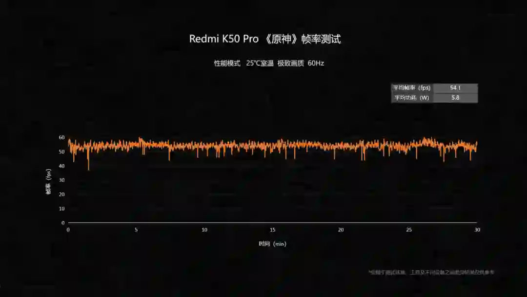 《原神》在极限画质 60Hz 模式下,K50 Pro 半小时平均帧率 54.1,虽然没有宣传中 59 帧以上那么夸张,但看得出红米放开了极限性能,整机平均功耗约为 5.8W,能效比不错,不过温度也随之升高。