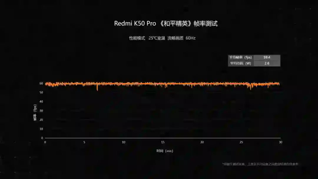 《和平精英》同样是暂未适配 90Hz 模式,流畅60Hz模式下,全程基本跑满,半小时平均帧率 59.4,整机平均功耗也只有 2.6W。