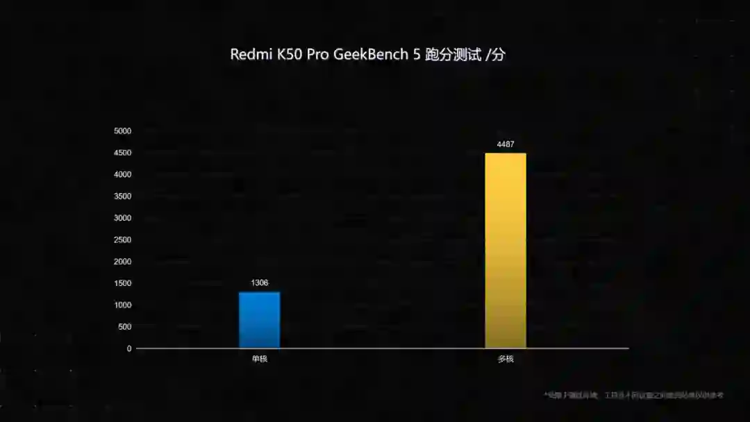 当然,娱乐兔看看就行,下面我们分别对 CPU 及 GPU 性能进行测试。K50 Pro GeekBench 5 CPU 单核成绩 1306 分,多核则是 4487 分,这个成绩战胜骁龙 8 Gen 1 毫无悬念,也比之前我们测试的 OPPO Find X5 Pro 天玑版略高一点。功耗方面,GeekBench 5 平台单核功耗约为 2.7W,多核为 6.2W,换算能效比分别为 484 和 724。
