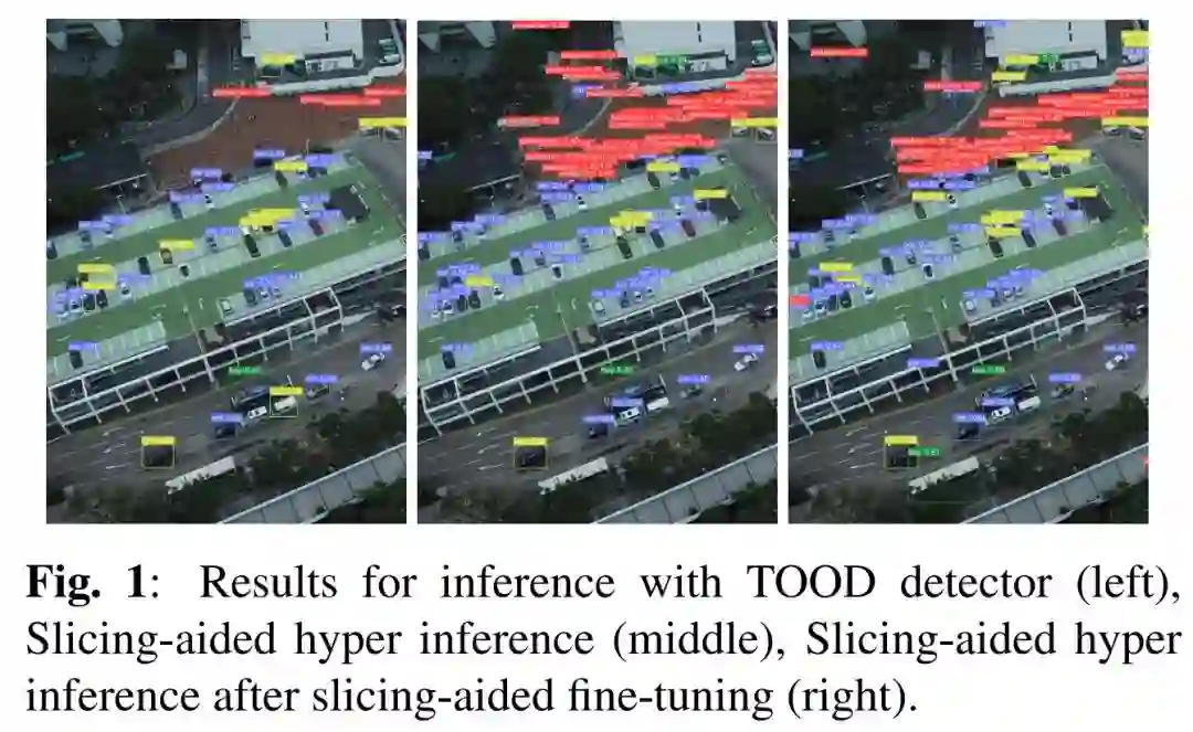 在本文中提出了一种基于切片辅助推理和微调的通用解决方案,用于高分辨率图像上的小目标检测,同时保持较低的复杂度和内存需求。图1显示了Visdrone测试集样本图像上小目标检测的改进。