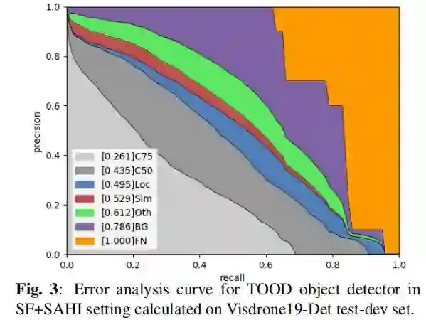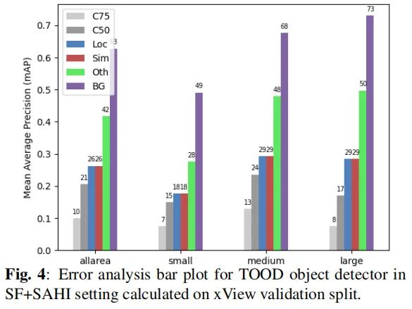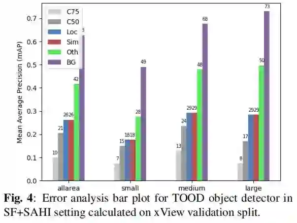 xView包含高度不平衡的60个目标类别,尽管FCOS是一个较老的,据说较弱的检测器,但对于这个数据集,FCOS比VFNet有更好的性能。这一观察结果证实了FCOS中Focal Loss的有效性,该方法旨在处理类别失衡。TOOD在训练过程中也受益于Focal Loss,在3种检测器中检测效果最好。tod检测器在Visdrone和xView数据集上的误差分析结果分别如图3和图4所示。