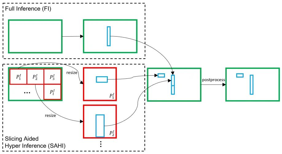 在推理步骤中也使用了切片方法, 如图3所示。首先,将原始查询图像I分割成1个M\timesN个重叠的patch 。然后,在保持高宽比的同时, 调整每个patch的大小。然后,对每个重叠的patch都独立地应用目标检测正向传递。使用原始图像的一个可选的全推理(FI)可以用 于检测较大的目标。最后,重叠的预测结果, 如果使用,FI结果使用NMS合并回原始大小。在NMS过程中,具有比预定义匹配阈值Tm的Union(IoU)比值更高的box被匹配, 并且对于每个匹配, 具有检测概率低于 的检测被删除。