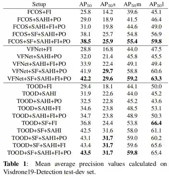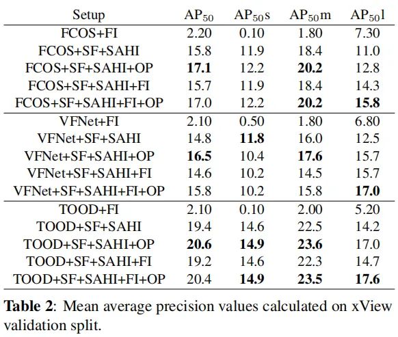 从表1可以看出,SAHI使目标检测AP分别提高了6.8%、5.1%和5.3%。SF可进一步提高检测精度,FCOS、VFNet和tod检测器的累计AP分别提高12.7%、13.4%和14.5%。在推理过程中,应用切片间25%的重叠,会增加小/中物体AP和整体AP,但略微降低大物体AP。增加是由切片预测的额外小目标真阳性引起,减少是由匹配大GT框的切片预测的假阳性引起。小目标检测AP以SF最佳,SI次之,大目标检测AP以SF最佳,FI次之,证实了FI对大目标检测的贡献。
