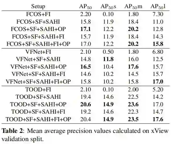 xView数据集的结果如表2所示。由于xView目标非常小,经常使用原始图像进行训练,检测性能较差,SF大大提高了结果。FI的集成使大目标AP增加了3.0%,但导致小型/中型目标AP略有下降,这是预期的,因为一些较大的目标可能无法从较小的切片中检测到。切片间25%的重叠可以增加2.9%的检测AP。
