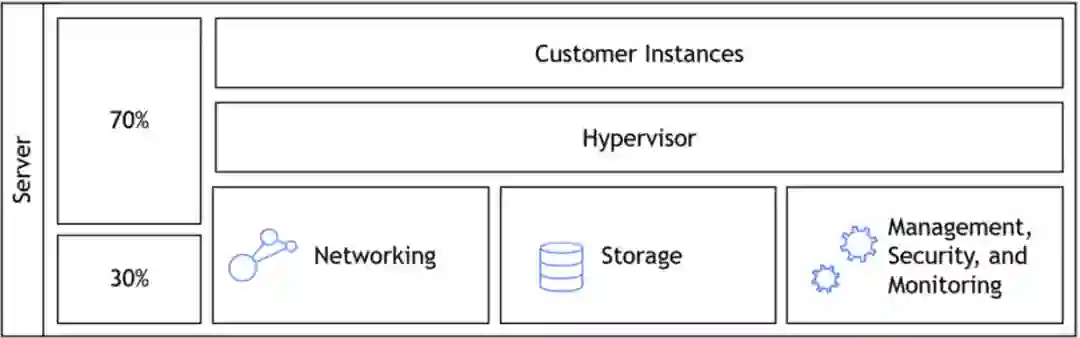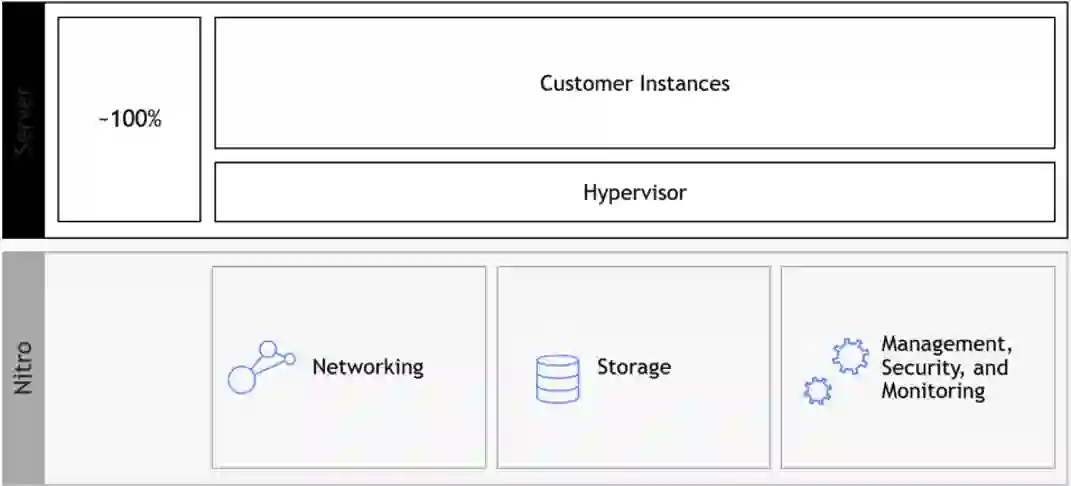 Nitro 是一组自定义硬件和软件,目的是将虚拟机管理程序、网络和存储虚拟化转移到专用硬件,从而释放 CPU 以更高效地运行。