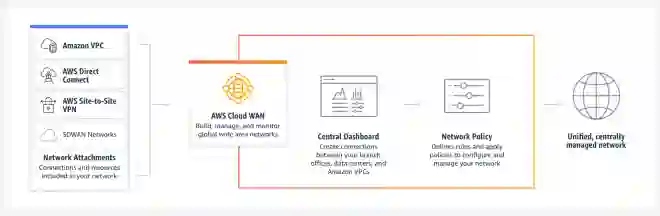 当网络在全球范围内延伸并且还需要混合各种技术时,企业构建、管理和监控它们的复杂度也会明显增加。在 2021 年 re:Invent 大会上,亚马逊云科技宣布了 Cloud WAN 全球网络托管服务。借助这项网络服务,企业可以借助于亚马逊的骨干网,使用 Cloud WAN 图形界面一键创建属于自己的全球网,实现设置中转网关或云连接,监控网络运行状况、安全性和性能等功能。