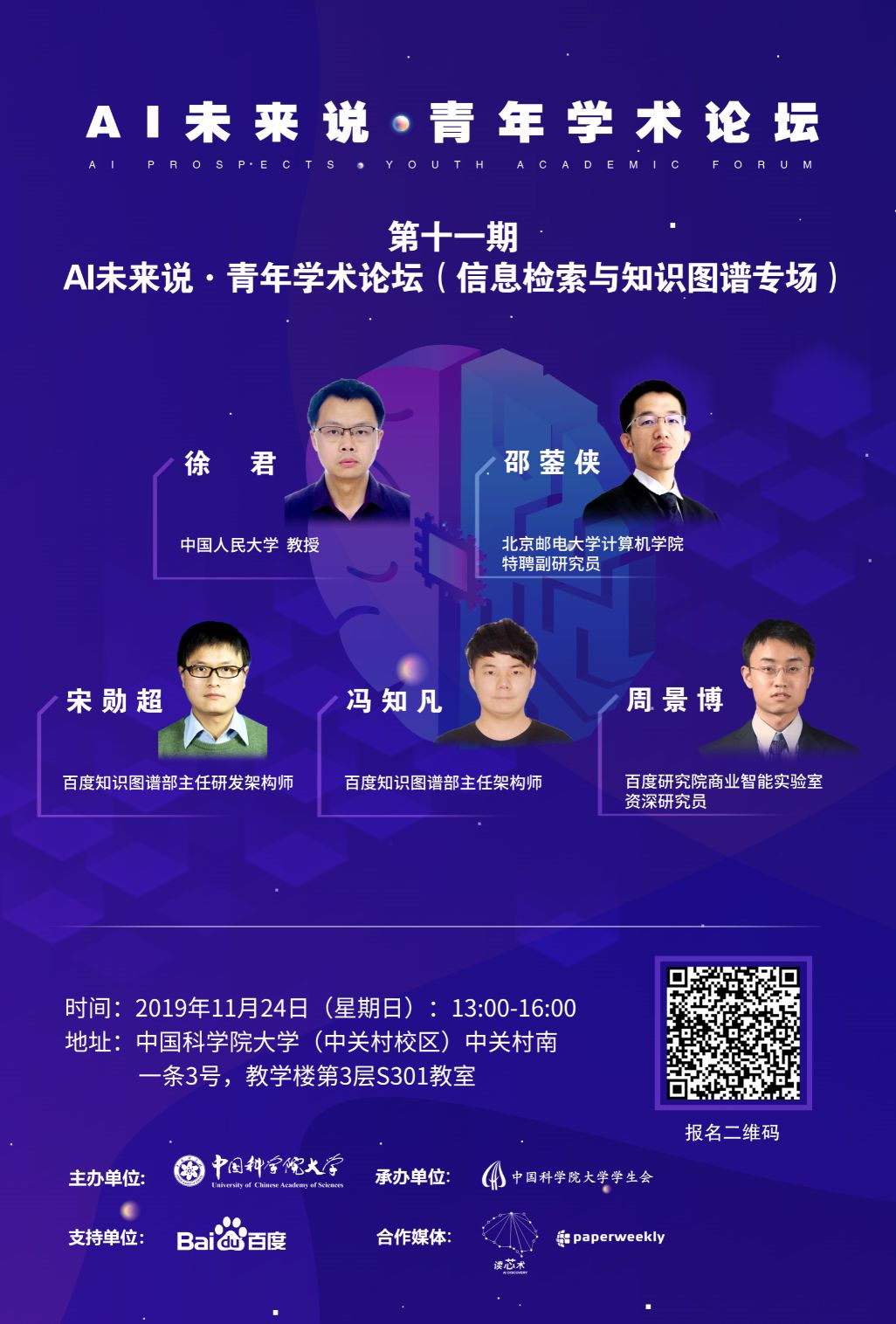 “AI未来说·青年学术论坛”系列讲座由中国科学院大学主办,承办单位为中国科学院大学学生会,协办单位为中国科学院计算所研究生会、中科院计算机网络信息中心研究生会、人工智能学院学生会、化学工程学院学生会、公共政策与管理学院学生会、微电子学院学生会、数学与系统科学研究院研究生会,百度为支持单位,读芯术、PaperWeekly为合作自媒体。“AI未来说·青年学术论坛”第11期将于2019年11月24日下午13:00-16:00在中国科学院大学(中关村校区)中关村南一条3号教学楼第三层S301举行。