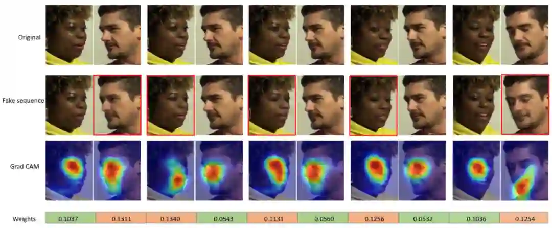 S-MIL 算法的最终检测效果图如下所示,从中可以看到,假脸的权重较高。这说明 S-MIL 方法在仅需视频级标签的情况下,可以很好地定位到假脸,且具有一定的可解释性。