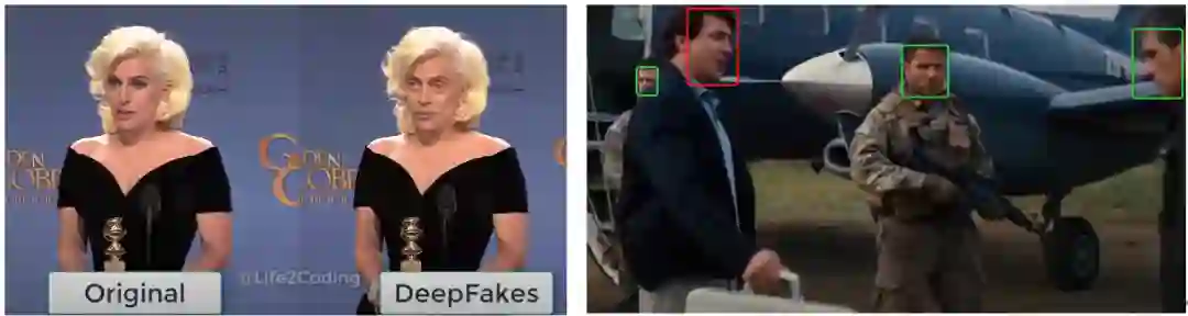 如下图所示,图 1 左图显示的是完全 DeepFake 攻击,其原图里仅有一张人脸被替换。而图 1 右图中有多张人脸,但只有红框中的人脸是被替换过的。