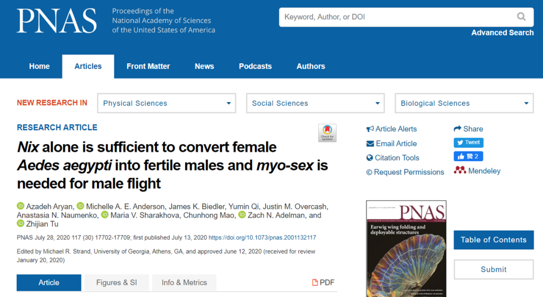 于是,科学家们就对蚊子的性别打起了主意。近日,弗吉尼亚理工大学的研究人员在《美国国家科学院院刊》上发表最新成果,证明仅仅通过改变 Nix 基因,就可以将雌性埃及伊蚊(花蚊子)转化为雄性,此外,研究人员还确定了控制雄性蚊子飞行的一种基因。