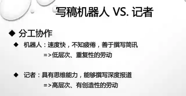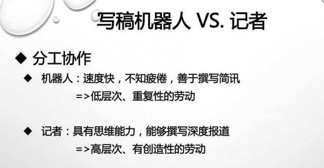 目前为止,机器人跟记者之间的关系是一种分工协作的关系。机器人现在不具有逻辑思维的能力,也不具备深度总结的能力,机器人只能把一个基本的新闻事实描述清楚,但是记者就可以写深度报道,比如说中国足球,记者可以经过自己的分析,写中国足球这几十年来落后的原因,也可以总结出几条观点,但是机器人就很难实现这样的能力。所以记者应该是从事有创造性的、高智商的稿件的创作,而把一些重复的、低层次的稿件创作的活动交给机器人完成,即记者和机器人是一种分工协作的关系。