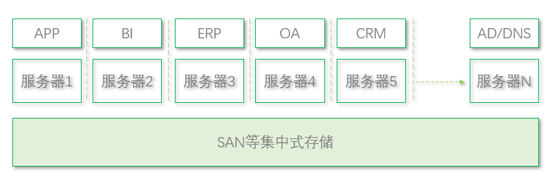 一般每台服务器上跑1-3个业务不等,各业务通过不同的安装目录和不同网络端口来隔离。所有服务器数据都存入NAS/SAN 等集中式存储。