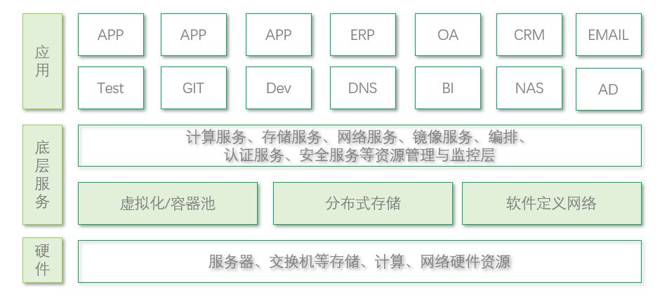 国内的云计算公司,都相应推出了企业内部部署的版本,与OpenStack的架构类似,核心也包含3大核心服务,以及各类上层应用服务。第2、第3这类通常是一些大型企业,或者技术运维能力很强的机构才会采用。通常需要企业自己配置开发运维团队。