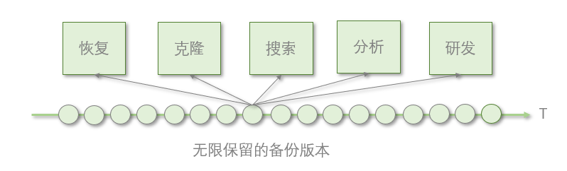 区别与云自己的快照,该能力可以基于任何历史点执行任意多次的恢复、克隆、读写等。